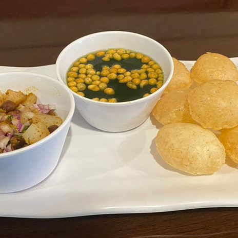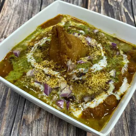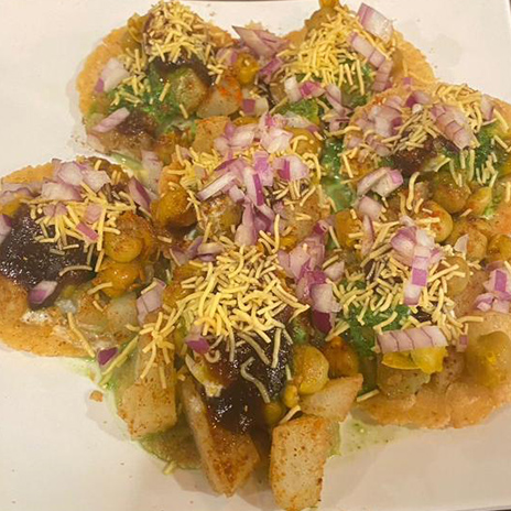 Fried potato patties served with chickpeas, yogurt, sweet tamarind and green chutney sauce