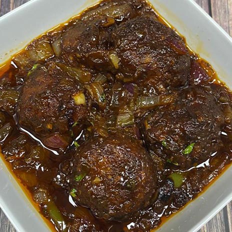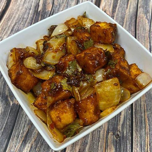 Deep-fried paneer fritters tossed in spicy curry sauce.