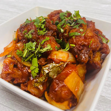 Cauliflower florets marinated with Indian spices, ginger and garlic paste in thick batter and deep fried & sauteed with spicy curry sauce