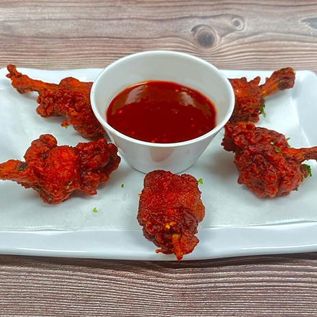 Deep-fried boneless chicken pieces marinated with Indian spices.