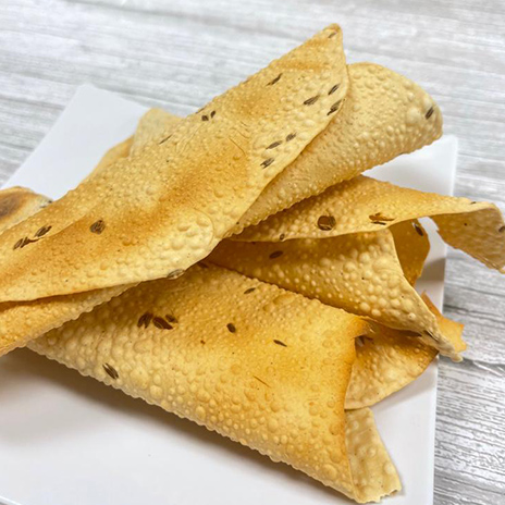 Thin crispy lentil wafers with cumin seeds roasted and fried and served with red tamarind chutney