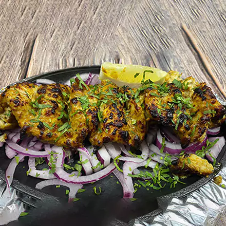 Grilled skewers of Chicken cubes marinated in fresh spices, herbs and yogurt