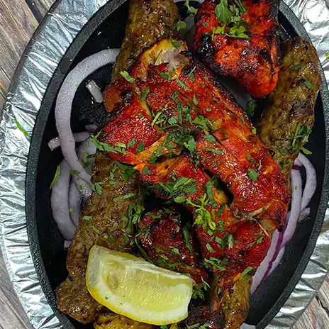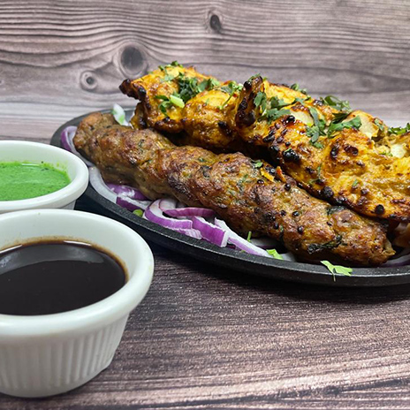 Tandoori Chicken, Chicken Seekh Kabab, Lamb Boti Kabab, Lamb Seek Kabab & Chicken Tikka seasoned in Indian herbs & spices & broiled in tandoor