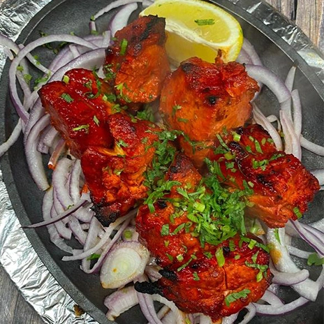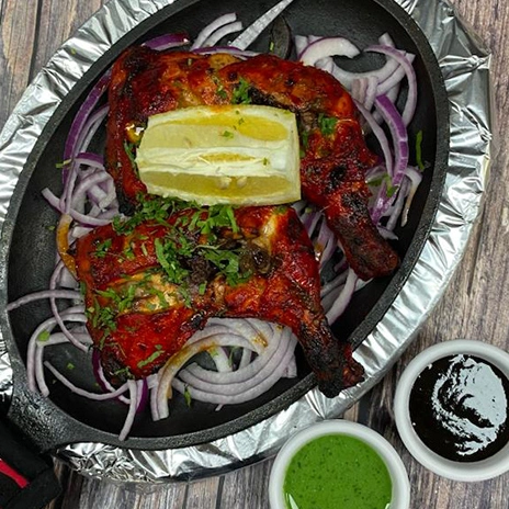 Chicken leg quarters marinated in fresh spices, herbs and yogurt, barbecued in tandoor