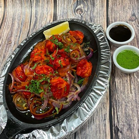White jumbo prawns enhanced with garlic-ginger sauce, lemon juice and yogurt, barbecued in tandoor
