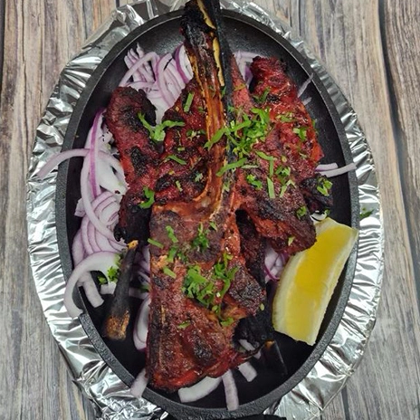 3 Jumbo Lamb Chops delicately spiced and marinated with yogurt, ginger-garlic and Indian herbs, roasted in grill
