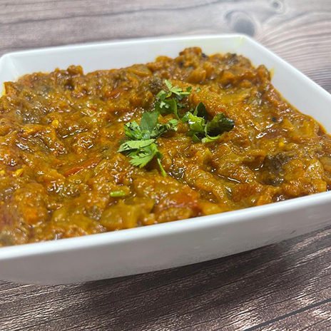 Roasted eggplant cooked with Indian spices, onion & green peas